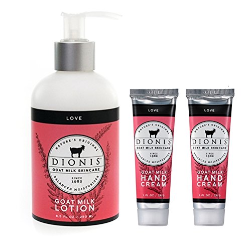 Three item set that includes one 8.5-ounce Dionis Goat Milk Body Lotion and two 1-ounce tubes of Goat Milk Hand Cream in "Love" scent.