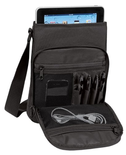 - Feature : Fleece-lined padded ipad/kindle/tablet/e-reader sleeve Organization panel with dual zippered pockets Adjustable shoulder strap Easy access front stash zippered pocket Sleeve: 10.5"h x 8"w x 1.25"d, fits most tablets