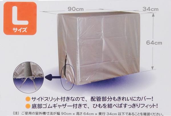 | 幅90×高さ64×奥行34cmのLサイズ(100V/200Vタイプ用)室外機カバーです。サイドスリット付きなので、配管部分もきれいにカバーします。底部ゴムギャザー付きで、ひもを結べばすっきりフィットします。 |