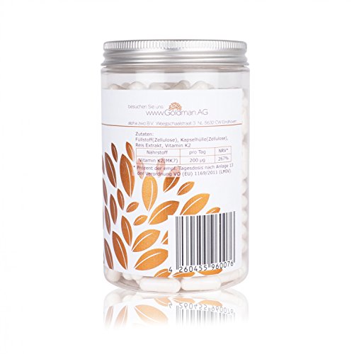 -. Feature : 200 µg Premium Vitamin K2 natürliches Menaquinon MK7 in pharmazeutischer Qualität ! / In Deutschland schonend halbautomatisch produziert ! / Ohne Magnesiumstearat und in vegetarischer Kapsel produziert ! / Original Goldman Qualität mit höchster Bioverfügbarkeit - zum Spitzenpreis ! / Schutz für gesunde Knochen und Gelenke - Essentiell beim Einbau von Kalzium in die Knochen - Herzgesundheit.