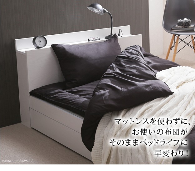 ●商品について:【フラットな床面で布団も使える収納付ベッド】フラットな床面でマットレス・敷布団どちらもお使いいただける2スタイルベッドです。宮棚、コンセント、引き出し収納とベッドに欲しい機能も充実。スチール製の桟で補強し約500kgの荷重にも耐えられる頑丈な造りになっています。