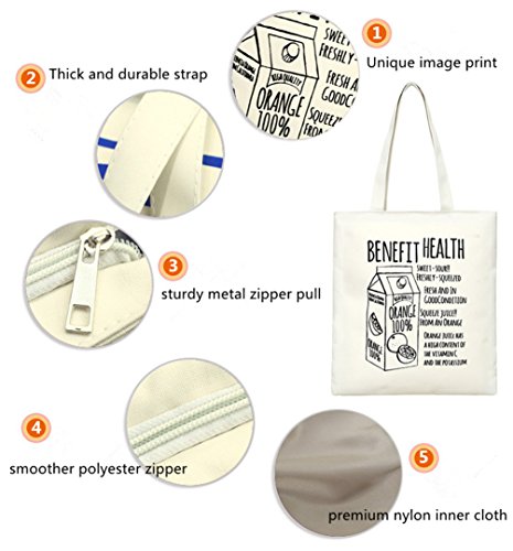 Canvas Tote Bag with Zipper Closure Grocery Shopping Bag Shoulder Bag for Women Girls Students