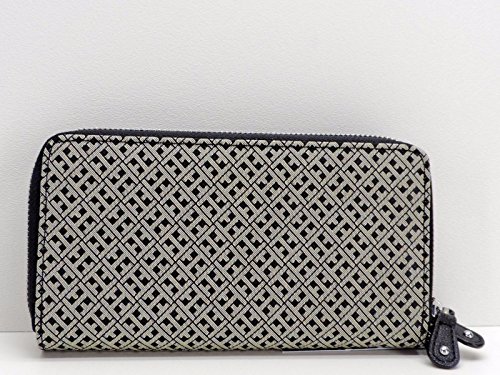 Product Description Authentic Tommy Hilfiger double zip around wristlet wallet in a black signature jacquard fabric with a beige logo design and black faux leather trim. 0