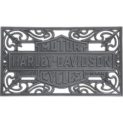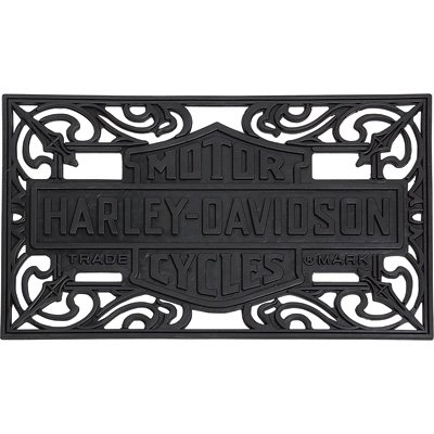 Roll out the welcome mat, Harley -style! Welcome riders and guests to your humble abode with a Harley-Davidson heavy-duty rubber entry mat with classic Bar and Shield logo molded right in. The 1/2in. thick shock-absorbing nonslip tread removes moisture and dirt from shoes, keeping the elements outside. Durable rubber will not crack or buckle and resists fading, mold and mildew. Easy to clean; simply hose off. 30in.W x 18in.D.Feature
