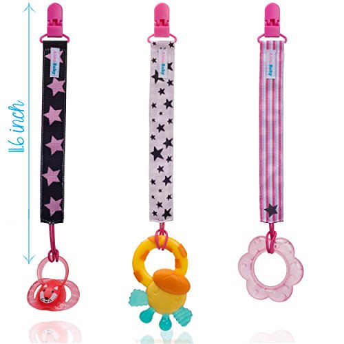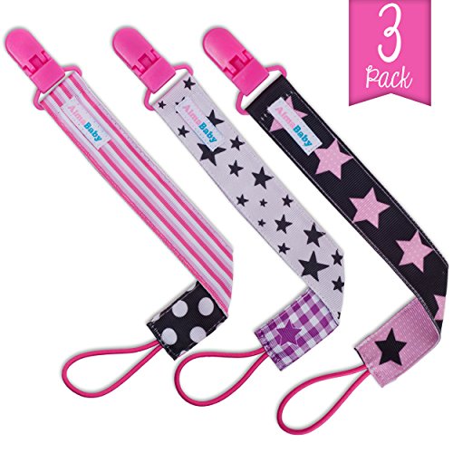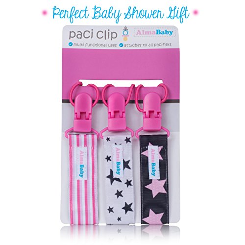-. Title : AlmaBaby Pacifier Clip Holders, Girls - Pink Stars 3 Pack - Universal Safety Clips for Paci Pod, Soothie, Toys and Blankets, Baby Shower Gifts, No Sharp Edges, No Rust