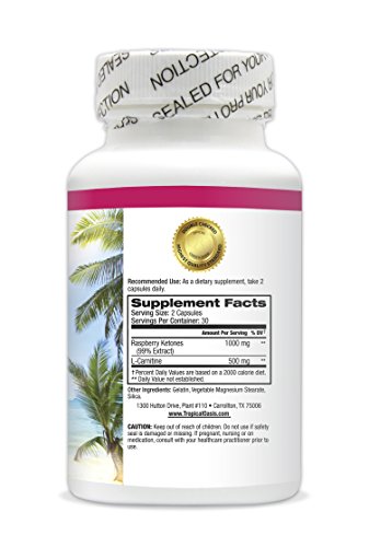-. Binding : Health and Beauty -. Brand : Tropical Oasis -. EAN : 0617279230894 -. Feature : MAXIMUM STRENGTH 1000mg of 100% Pure Raspberry Ketones: Provides you with increased energy and a faster metabolism to help you burn fat! / PLUS 500MG OF L-CARTINE: L-carnitine is an Amino Acid that transfers long-chain fatty acids, such as triglycerides into mitochondria, where they may be oxidized to produce energy / INCREASES ADIPONECTIN: This hormone is released by fat cells and is believed to play a role in regulating metabolism. Raspberry Ketones increase your adiponectin levels which tricks your body into burning more fat. / ZERO SIDE EFFECTS: Tropical Oasis Raspberry Ketones w/ L-Cartine contain no stimulants and offer a SAFE natural way to help you achieve your weight loss goals! / MONEY BACK GUARANTEE: We stand behind our products so if you're not 100% Satisfied simply return it for your money back! -. IsAdultProduct : 0 -. Label : Tropical Oasis -. Manufacturer : Tropical Oasis -. MPN : 617279230894 -. PackageQuantity : 1 -. PartNumber : 617279230894 -. ProductGroup : Health and Beauty -. ProductTypeName : HEALTH_PERSONAL_CARE -. Publisher : Tropical Oasis -. Studio : Tropical Oasis -. Title : Premium 1000mg Raspberry Ketones + 500mg L-Carnitine - Maximum Strength Natural Weight Loss and Fat Burning Blend - Helps suppress appetite, raise metabolism, increase energy*- 60ct -. UPC : 617279230894