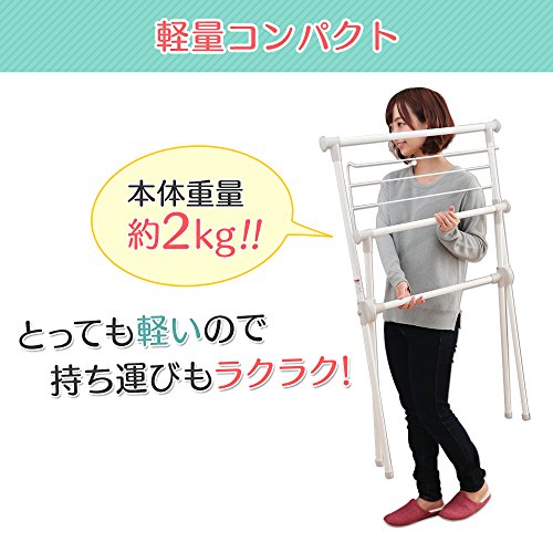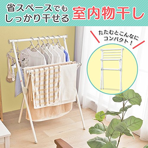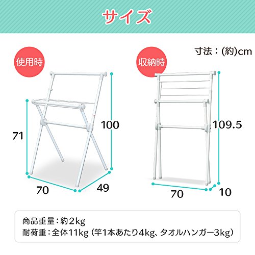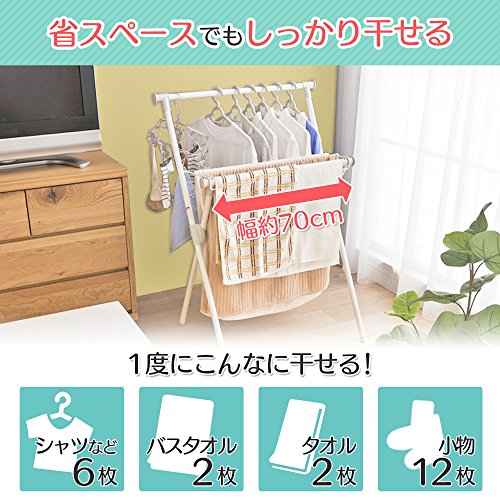 ◆省スペースにたっぷり干せるコンパクトタイプ◆折りたたみが簡単で、使用しないときはコンパクトに収納できます。◆干す量の目安:約2人分(シャツ等6枚、バスタオル2枚、タオル2枚、小物12枚) / ■ 仕 様 ■商品サイズ(約):幅70×奥行49×高さ100cm 収納サイズ(約):幅70×奥行10×高さ109.5cm 商品重量(約):2kg 耐荷重(約)・・・・全体:11 ・竿部:8kg・ワイヤーハンガー部:3kg 材質:塩化ビニル樹脂被覆鋼管、ポリプロピレン 組立:お客様組立 / ※こちらの商品はお客様組立てとなっております。