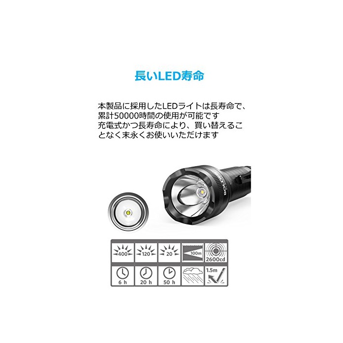 장수명:충전식의 고품질 배터리 내장(3350mAh)에 의하고, 중 빔 모드이면 약20시간 연속 사용 를 할 수 있습니다.또한LED라이트는 약50000시간의 길이 수명입니다.5V 1A출력 AC어댑터와 Micro USB케이블(동봉)를 이용하여배터리 자체를 약6시간으로 풀 충전으로 옵니다.※AC어댑터는 부속하고 있지 않습니다.