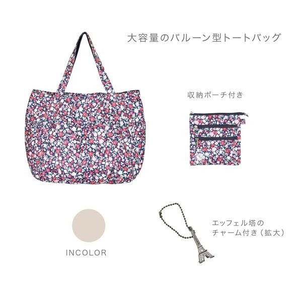 | 肩掛けもできる、大容量のバルーン型のトートバッグ。バッグには内ポケット1つと外側に4つのポケットが付いています。本体のベルトを使えば、キャリーケースへの固定OK。旅行用はもちろん、普段使いにも便利。 |