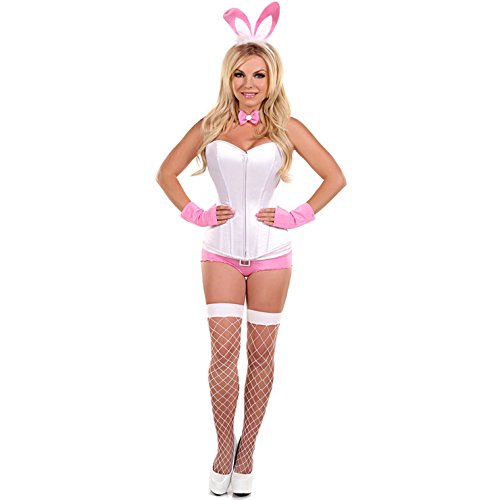 -. Feature : Recht rosa Häschen-Kostüm einen weißen Kunststoff- Knochen Korsett mit Front -Reißverschluss mit , Spitzen-up zurück , rosa Beute Shorts passend , Bogen Halsband , rosa fingerlose Handschuhe und weiße Häschenohrstirnband . / Strümpfe und Schuhe.