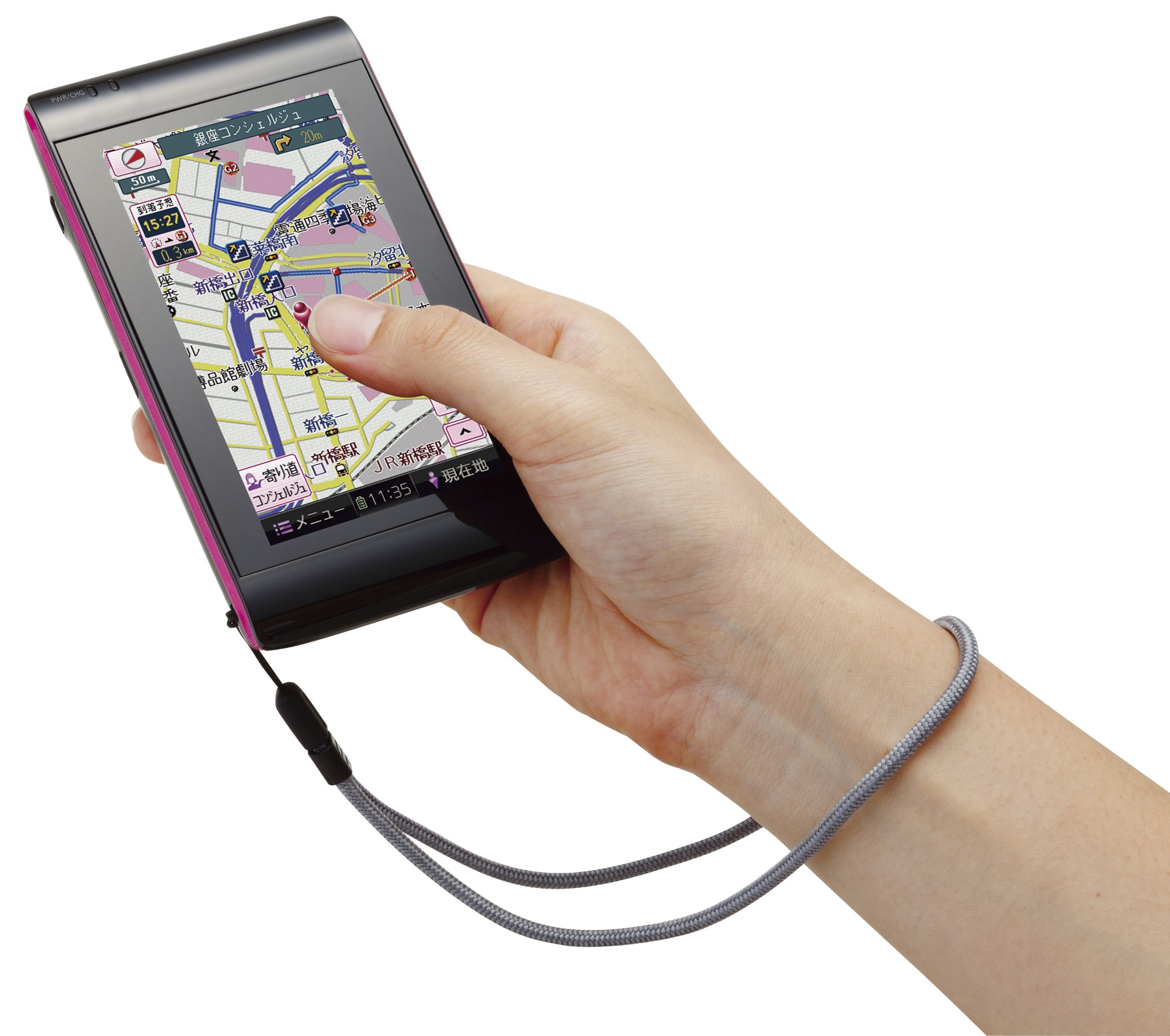 When walking, it is used vertically, but when using it as a car navigation system, it is laterally fixed to an in-vehicle suction cup stand that can detach "Travel Navi" with a single touch.