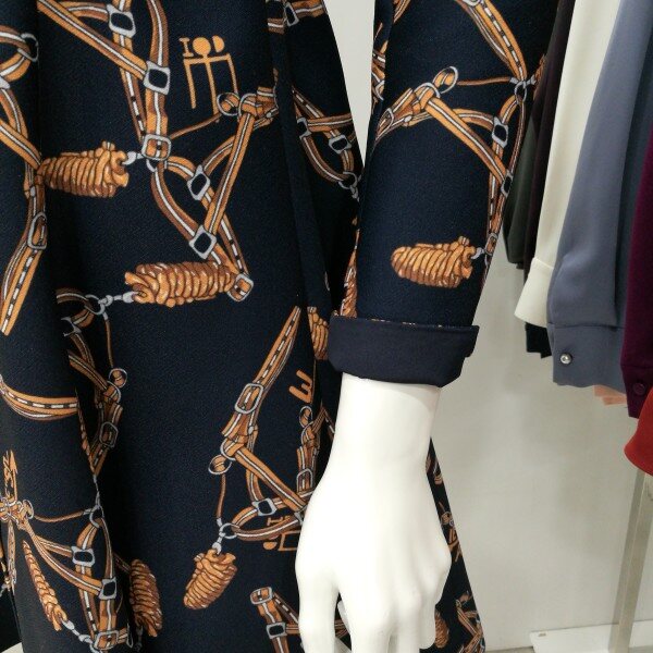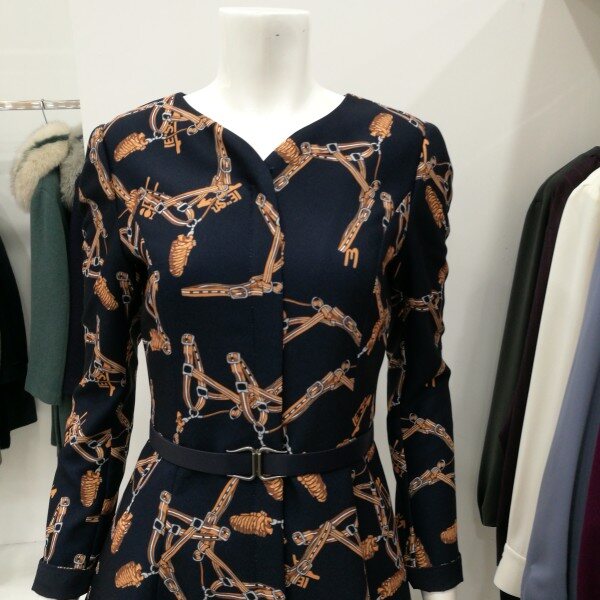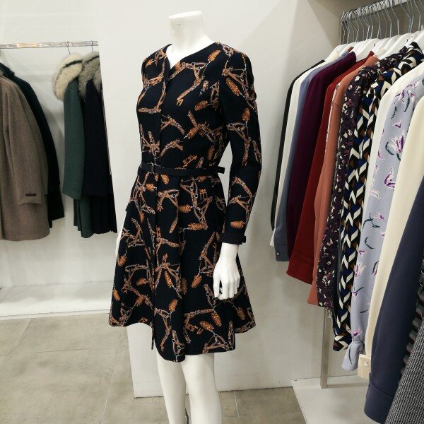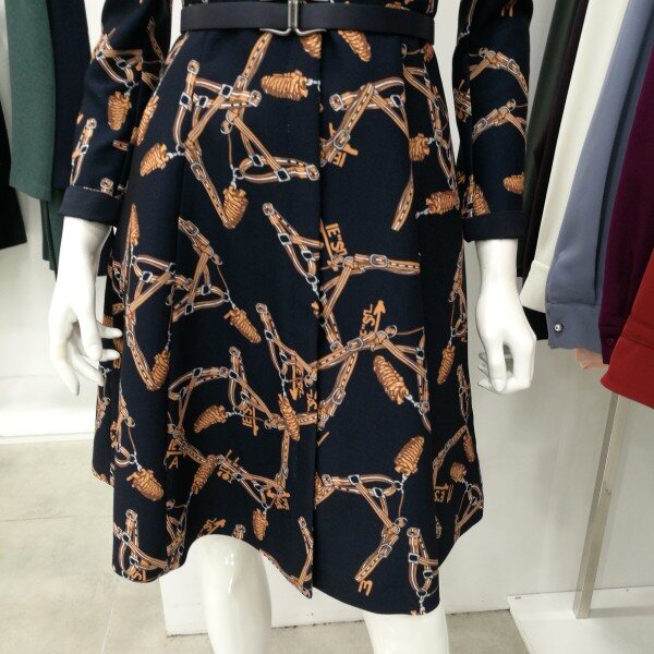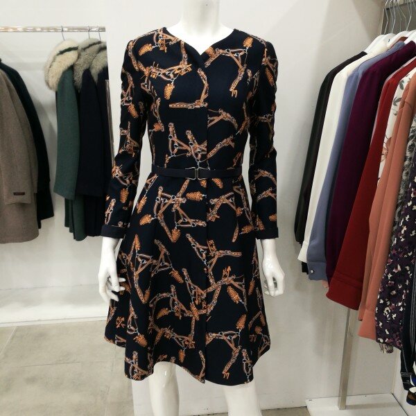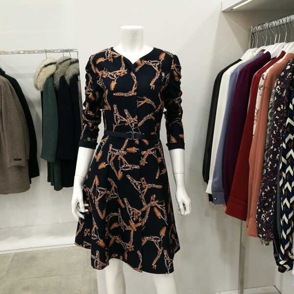 스카프무늬의 원피스로 고급스러우며 세련되었고 플레어로 되있어 활동하기 편하고아주 날씬해 보인다. 입으면 훨씬 밝아보이고 예쁘다.