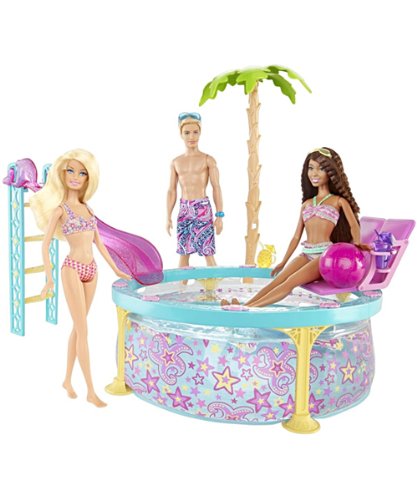 - Feature : Make a stylish splash in the Barbie Glam Pool / Slide down the super sparkly slide or relax under a palm tree / There is always time for more fun in the sun with Barbie and her friends / Features a two-doll lounge chair with cup holders, a palm tree and slide / Includes pool and tons of fun in the sun accessories