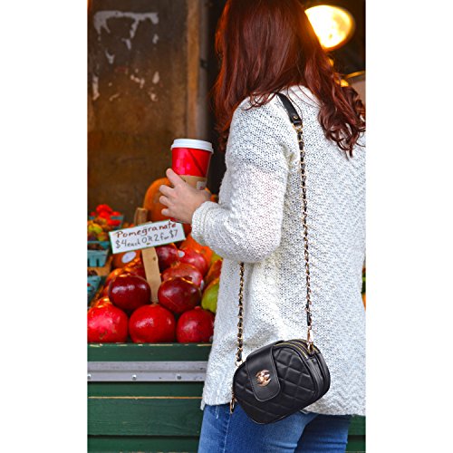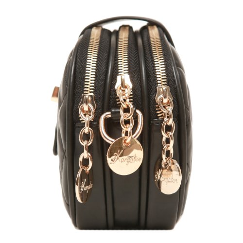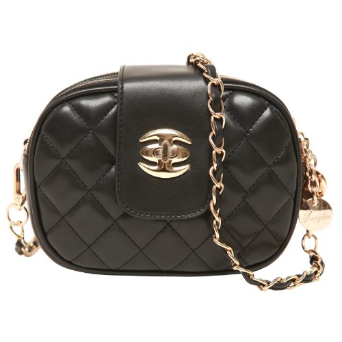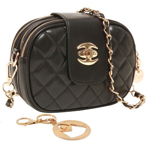 - Feature : Classic design of diamond quilted leatherette accented with shiny gold hardware. / Decorative and removable leatherette wrapped gold-tone chain strap included. / Turn-lock closure and 3 zippered fabric-lined compartments with plenty of room to store your daily essentials that also offers easy access. / **Official MG Collection® product by MyGift® features signature keychain charm** / Approximate Dimensions: Exterior- 7.5" W x 5.5" H x 3" D; Interior (each of the 3 compartments)- 7" W X 5" H X 1" D; Shoulder Strap (fully extended) - 24" shoulder drop.