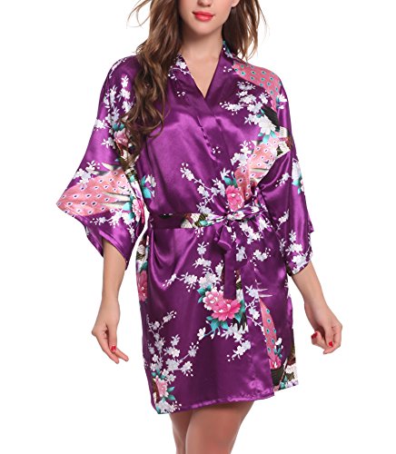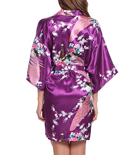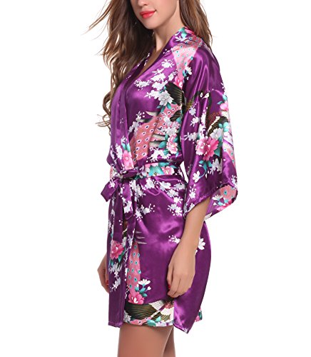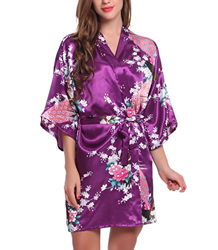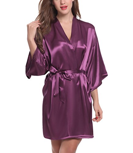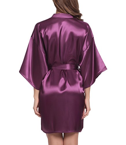 ADORNEVE Women's Kimono Robe Dressing Gown Short Classic Satin Wedding Nightwear Purple Medium