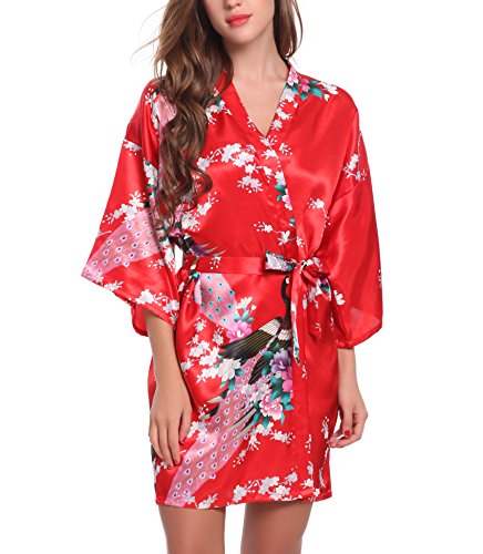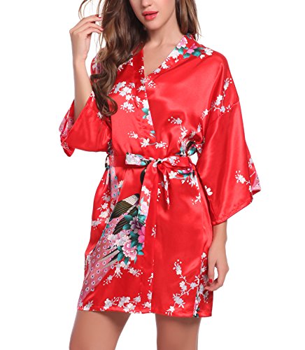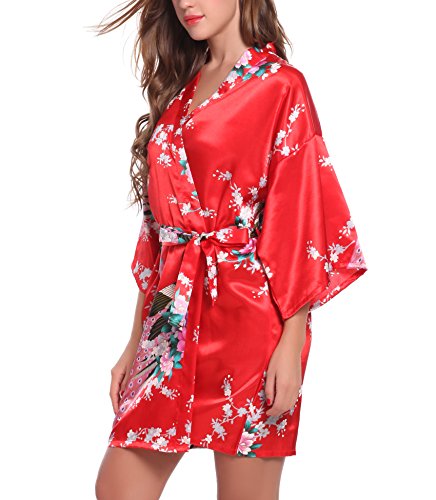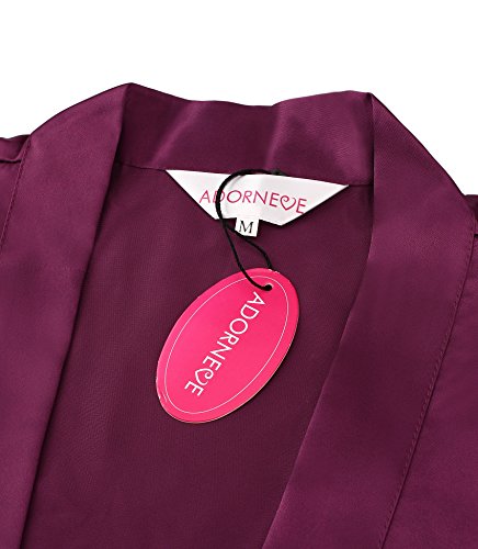 ADORNEVE Women's Short bridesmaids Kimono Robes Satin Mini Sleepwear Claret Large