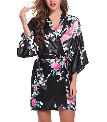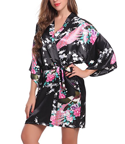 ADORNEVE Women's Sexy Kimono Robe Short Peacock Blossoms Satin Nightwear Pajamas