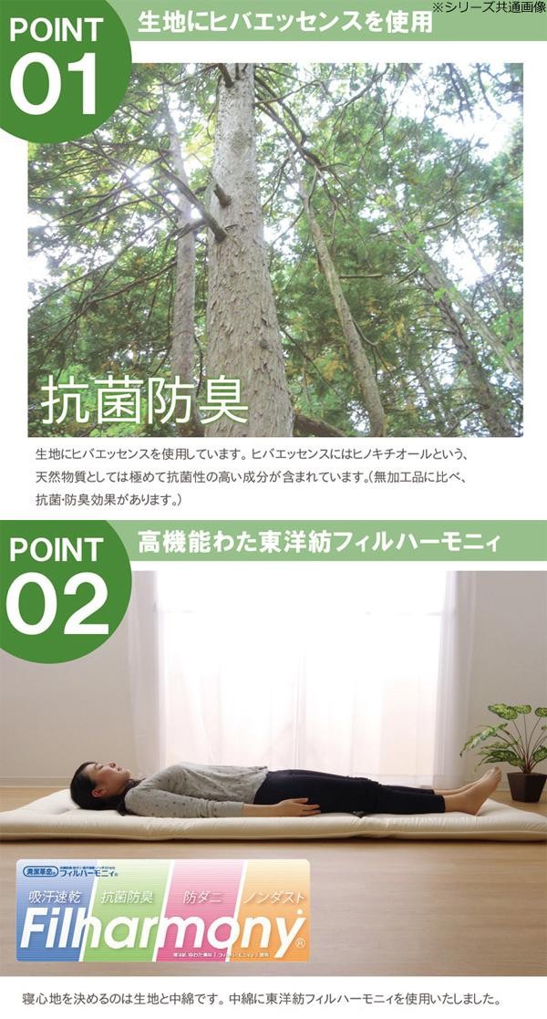 | 生地表面にヒバエッセンスを使用、中わたに東洋紡の特殊なわた、フィルハーモニィを使用した敷き布団です。 |