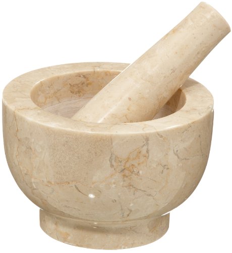 - Mortar and pestle made of solid uncoated white marble for longevity