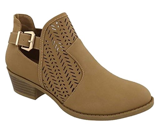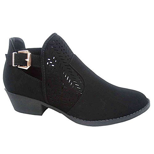 Product DescriptionWomen buckle low heel ankle booties. Laser cut and buckle detail. Adjustable buckle strap. Comfy low stacked heels.0