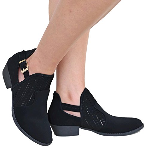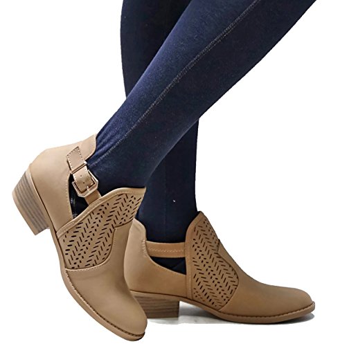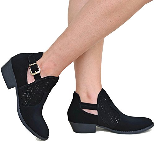 TOPMDA Women's TCv1 Buckle Perforated Cutout Western Ankle Booties Low Heel Boots