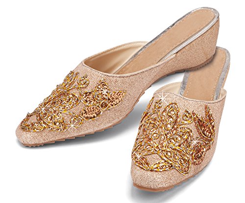 Binding : Apparel Product Description Glamorous mules set the gold standard. These golden embroidered slip-ons are festive and oh-so feminine, decorated in elaborate gold and silver metallic embroidered scroll work. Classic, open-back slip on in glittery, golden polyester fabric with charming 2" kitten heel. Imported. 0