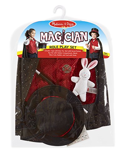 Abracadabra, hocus-pocus, presto! Young magicians will be delighted with this impressive role play set. Kids can make a coin magically appear and disappear from the secret vest pocket or pull a rabbit out of the top hat's hidden compartment. Set also includes a cape with bow tie, magic wand, and card with tricks. Prepare to be amazed!Feature