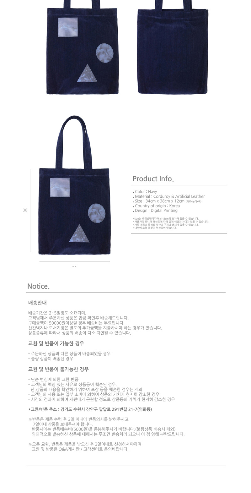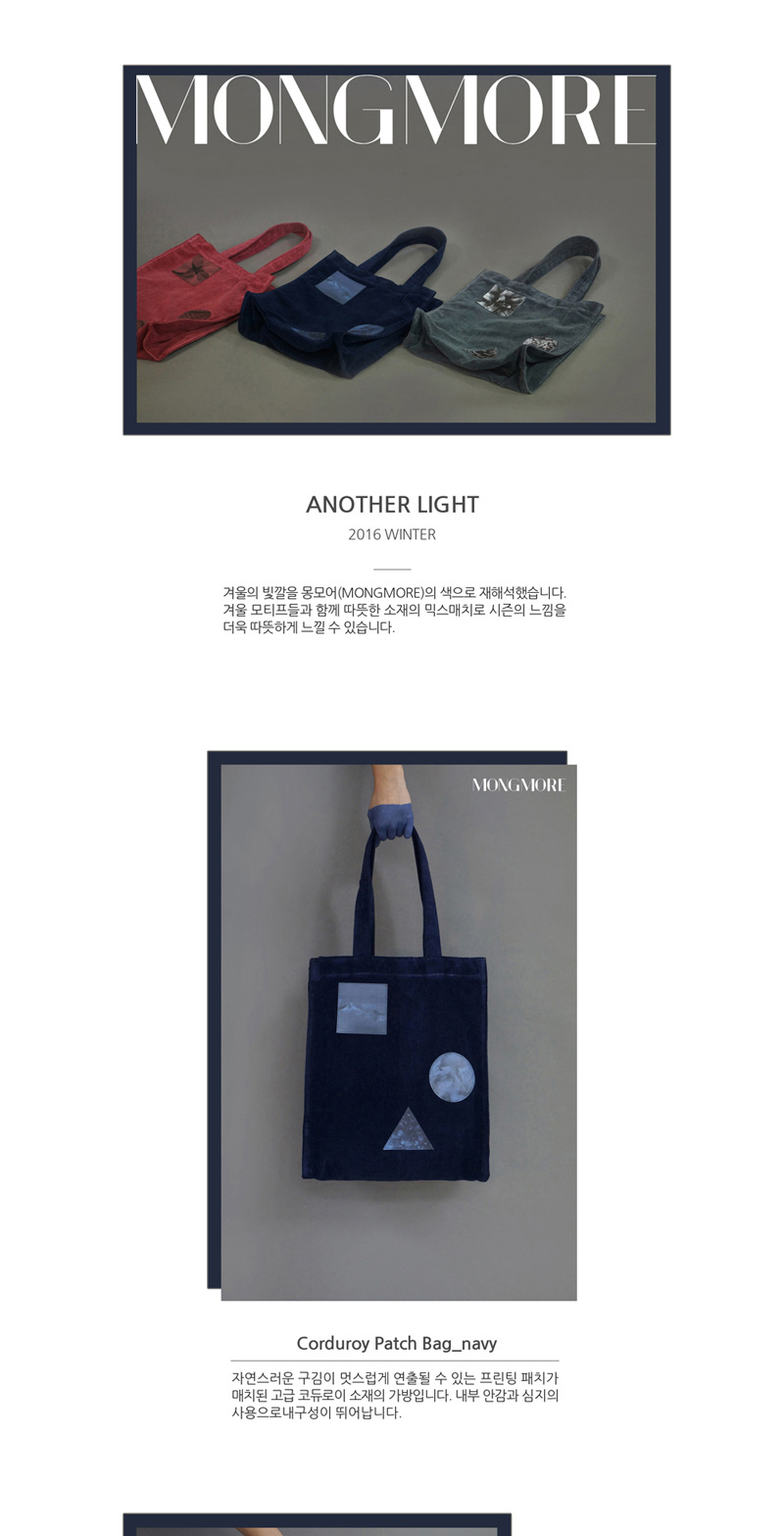 - 주문시 유의사항 : 배송기간은 2~5일정도 소요되며, 고객님께서 주문하신 상품은 입금 확인 후 배송해드립니다. 구매금액이 50000원 이상일 경우 배송비는 무료입니다. 산간벽지나 도서지방은 별도의 추가금액을 지불하셔야 하는 경우가 있습니다. 상품종류에 따라서 상품의 배송이 다소 지연될 수 있습니다. 겨울의 빛깔을 몽모어의 색으로 재해석했습니다. 겨울 모티프들과 함께 따뜻한 소재의 믹스매치로 시즌의 느낌을 더욱 따뜻하게 느낄 수 있습니다. 자연스러운 구김이 멋스럽게 연출될 수 있는 프린팅패치가 매치된 고급 코듀로이 소재의 가방입니다. 내부 안감과 심지의사용으로 내구성이 뛰어납니다.