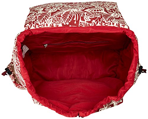 -. Feature : Drawstring top closure as well as front flap with push lock closure / Large main compartment plus two side cinch pockets / Fully padded back panel for cushioning comfort / Two outside zipper pockets / 15"H x 13"W x 5.5"D / Pockets: 1 interior zip, 4 exterior