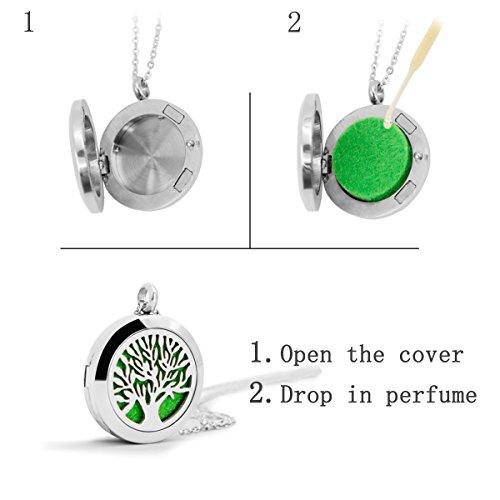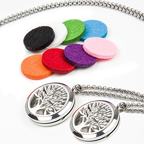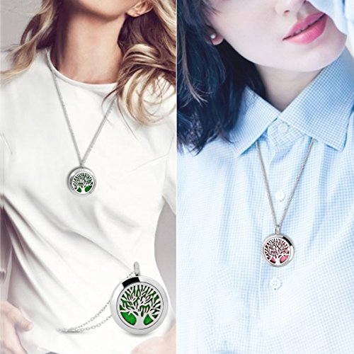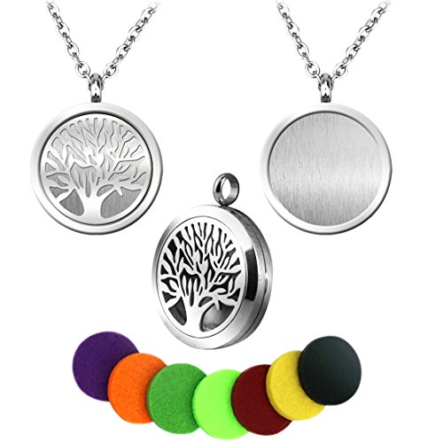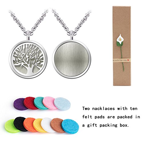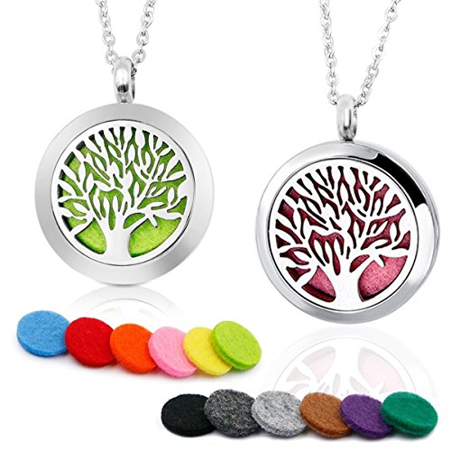 [2 Pack] BRIGHTSHOW Aromatherapy Essential Oil Diffuser Necklace-Stainless Steel Tree of Life Locket Pendant,10 Refill Pads