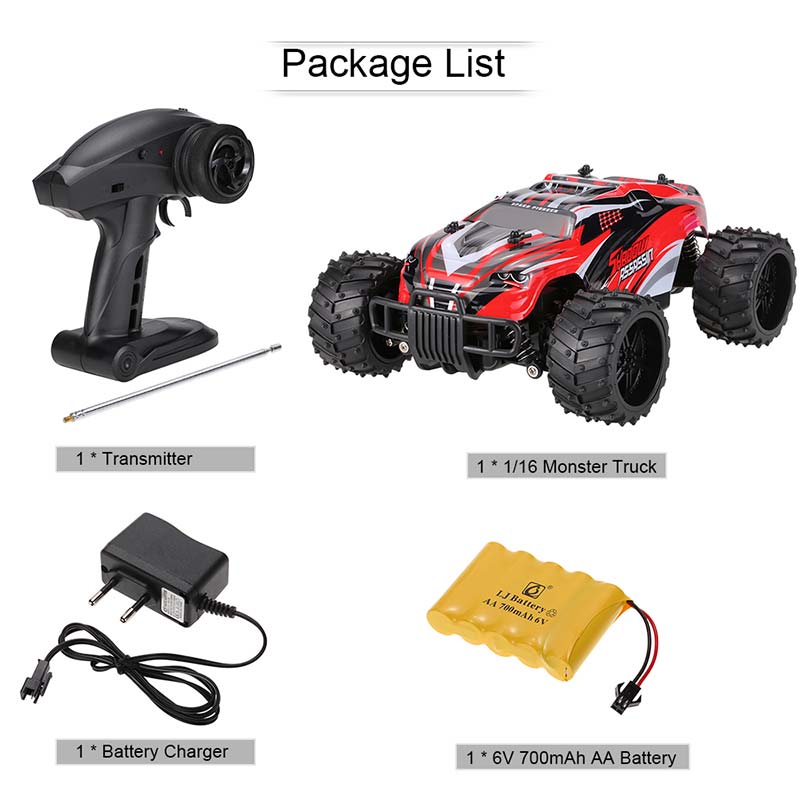 This 1:16 Monster Truck will be a perfect gift for children. It can run on the flat ground, sand land, grassland. With high performance and cool appearance, it will let your children experience a different kind of joy. And it is ready to run. Don't hesitate to take it home.