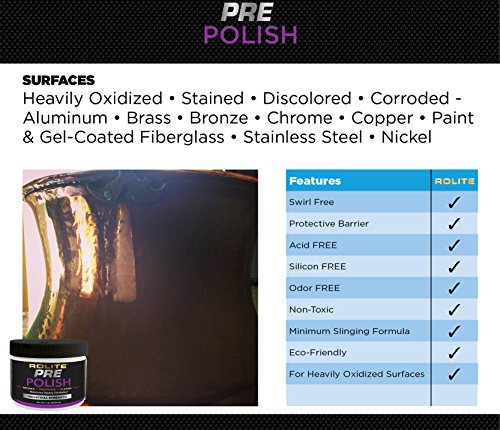 ReleaseDate : 2017-09-20 Studio : Rolite Company Publisher : Rolite Company Binding : Misc. Product Description Great for the removal of heavy oxidation, stains, discoloration and corrosion. Not recommended for use on plated metals. Directions: Some settling may occur during shipping, stir before using. For best results, apply Rolite Pre-Polish with a clean, dry microfiber cloth ? do not use water. Surface should be clean, dry and free of dust prior to application. Apply sparingly. Rub gently in a circular motion. For maximum shine, buff off immediately while Rolite Pre-Polish is still moist ? do not let dry. Product sold by weight not volume. For best results follow up with Rolite Metal Polish. 0