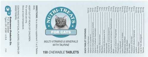 -. Binding : Health and Beauty -. Feature : Chewable & Tasty Treats Pets Like / Rational Formula / Glucosamine 100 mg for repair and maintaining healthy cartilage / Calcium Ascorbate (Vitamin C) is non-acidic and less likely to cause gastric distress / Selenium is included because mounting evidence indicates this essential mineral is lacking in many pet diets -. Label : Endurance Products Company -. Manufacturer : Endurance Products Company -. ProductGroup : Health and Beauty -. ProductTypeName : HEALTH_PERSONAL_CARE -. Publisher : Endurance Products Company -. Studio : Endurance Products Company -. Title : Nutri-Treats for Dogs and Cats
