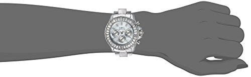 37 white crystal accenting the mother of pearl dial with silver and white hands and hour markers, chronograph with 24 h, day and date sub dials, steel stainless steel band and push crown