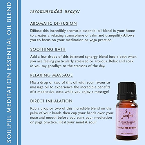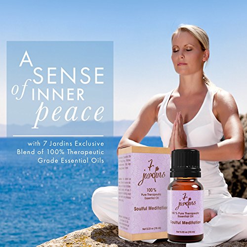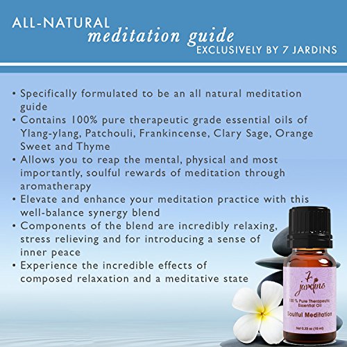 Feature : TOP QUALITY INGREDIENTS - Contains a unique blend of Patchouli, Clary Sage, Ylang-ylang, Frankincense, Sweet Orange and Thyme to enhance relaxation and get you into the meditative state. Great for students, retirees, yogis, moms or anyone who needs a moment to relax and regain focus from time to time. / PERFECT FOR MEDITATION - 7 Jardin's Soul Meditation Synergy Blend can help enhance your meditation experience by grounding you and promoting a sense of calm. Everyday life can be stressful and hectic that we crave the sense of stillness in clarity and take a moment to just sit back, relax and put our mind at ease. / EASY TO USE - Just add a few drops into your essential oil diffuser for aromatherapy or after a long day of work to help center your mind and soul. You can also keep it in your purse, bag or car, pop off the lid and inhale whenever you need to clear your thoughts. / SUPERIOR QUALITY ESSENTIAL OIL - Our Soul Meditation Oil is sourced using the best ingredients from all over the world to ensure that it is 100% pure, natural, non toxic, unfiltered, undiluted without added fillers or artificial ingredients. We only source the best to ensure potency, safety and bottled directly in the USA. / 100% SATISFACTION GUARANTEE - At 7 Jardins we're committed to providing the best quality customer service. We're so confident that you'll love all of our Products, so Click to ADD TO CART Button to buy our Product with confidence