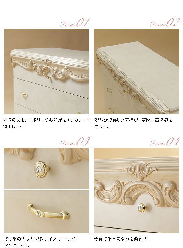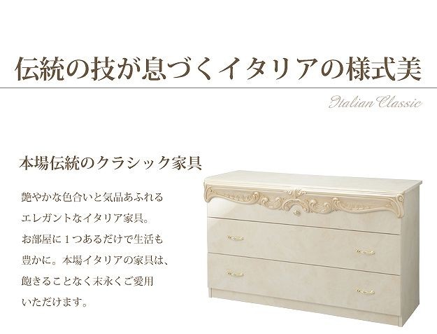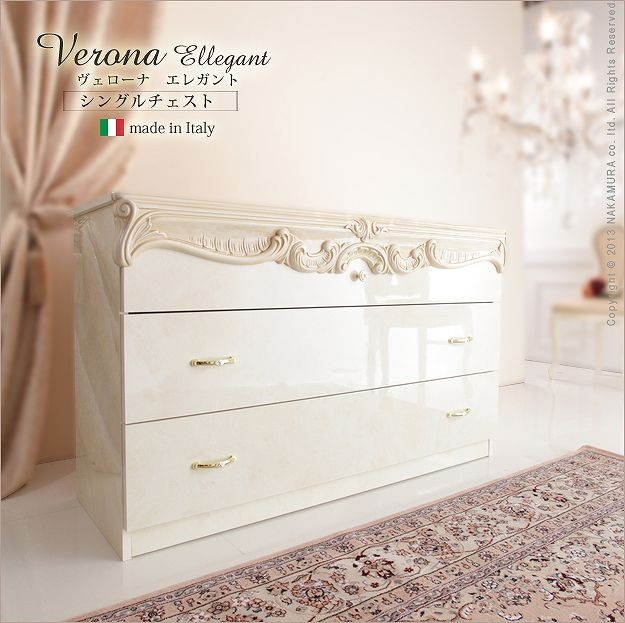 芸術作品ともいえるイタリア直輸入家具をご自宅に☆ヴェローナエレガントシングルチェスト。艶やかな色合いが気品あふれるエレガントな本場伝統のクラシック家具です。優美な取っ手と立体感のある前飾りは高級感があります。