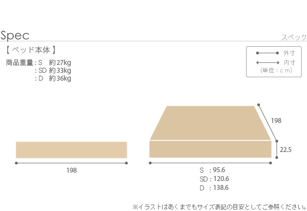 サイズ(cm):幅95.6x奥行198x高さ22.5(床板高さ22.5)cm・約27kg