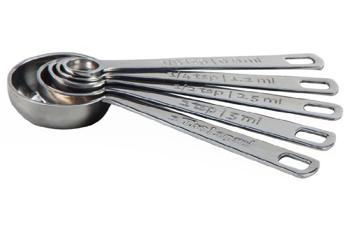 - 5 piece set includes: 1/8 tsp; 1/4 tsp; 1/2 tsp; 1 tsp; and 1 tbsp