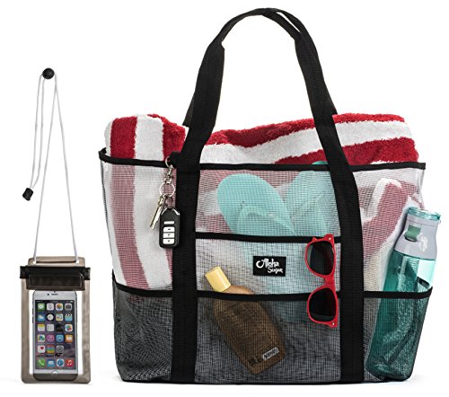 -. Feature : HIGH QUALITY MESH BEACH BAG - Constructed from high quality durable mesh, this lightweight beach bag is the best tote bag for the beach! The superior (see-thru) mesh material is designed so that sand and water flow right through and will not fill up the bag. This bag is mildew and water resistant. To clean off, simply wipe the bag clean! / EXTRA LARGE BEACH BAG - 17.5"L x 15.15"H x 9.6"W; (Inches). This HUGE beach tote bag has 7 outer pockets so that you can store all of your beach essentials and is still lightweight and comfortable to carry. The beach bag also has a keychain to safely keep your keys wherever you are. There is also an attached inner bag where you can securely store your valuables. These spacious and quality features make this the perfect GIANT beach bag! / PVC PHONE CASE - This bag features a PVC water-resistant phone case that will protect your phone from both sand and water. The transparent quality screen allows you to actually use the phone while it is still securely held in the case! No more worrying about losing your phone or having it damaged at the beach - this beach bag will ensure that you can focus on enjoying yourself instead of worrying about your things! / BEST BEACH BAG - The HUGE spacious compartments of this beach bag and the quality water-resistant mesh material make this the best beach bag for your travels. Unlike other beach bags, this tote bag is also perfect to use for the gym, weekend getaways, family vacations and various other uses. Easily store your beach towels, sunscreen, sunglasses, sandals, beach toys, food for the beach, drinks for the beach, phone in the PVC protected case, valuables and all other essentials! / ENVIRONMENTAL COMMITMENT - Your purchase today will result in the planting of 10 trees in Haiti, Madagascar and Nepal. Together we will work to restore native forests and lift local villagers out of extreme poverty by creating tree planting jobs.