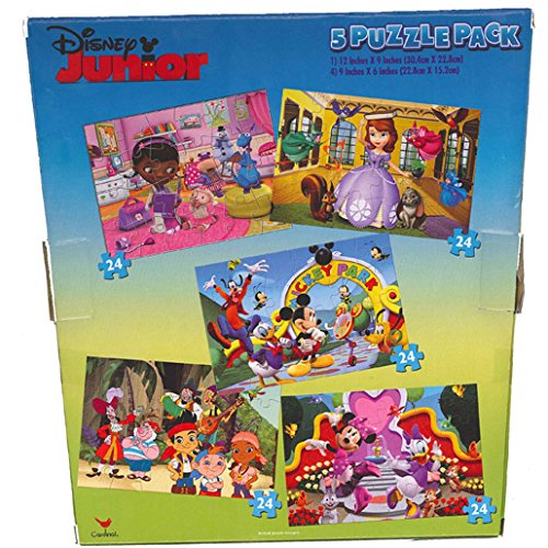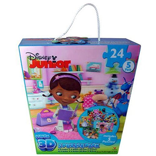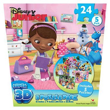 -. Binding : Toy -. Brand : Cardinal -. Color : Blue -. Department : girls -. EAN : 0047754103052 -. Feature : Contains 5 super 3D puzzles. / Each puzzle contains 24 pieces. / Contains a Doc Mcstuffins, Jake and the Neverland Pirates, Mickey Mouse, Minnie Mouse, and Sofia the First puzzles. / One puzzle measures 12" x 9" and the other four measure 9" x 6". -. IsAdultProduct : 0 -. Label : Disney -. LegalDisclaimer : for ages 3 years and over -. Manufacturer : Disney -. Model : 65546-1 -. MPN : 65546-1 -. NumberOfItems : 1 -. PackageQuantity : 1 -. PartNumber : 65546-1 -. ProductGroup : Toy -. ProductTypeName : TOYS_AND_GAMES -. Publisher : Disney -. Size : 0 -. Studio : Disney -. Title : Disney Junior Super 3D Puzzles - 5 Pack - Assortment of Characters and Shows -. UPC : 047754103052