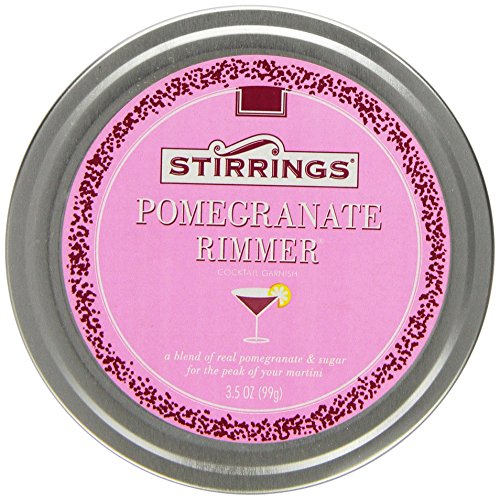 -. Feature : Sweet-tart pomegranate sugar (3 oz) for decorating rims of cocktail glasses. / Made with crushed pomegranates and sugar, (all natural ingredients), in the USA. / A pop of flavor and pretty garnish to martinis, mojitos, margaritas or the cocktail of your choice. / Great for decorating baked goods. / Airtight tins can be re-used for storing herbs and spices.