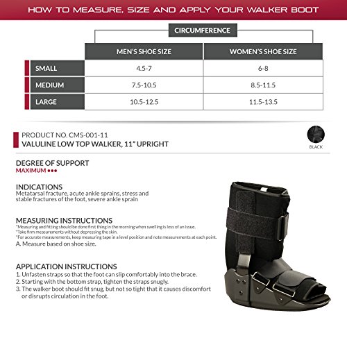 ReleaseDate : 2017-06-28 Studio : Surgical Appliance Industries Publisher : Surgical Appliance Industries Binding : Health and Beauty Product Description OTC brand (model CMS-001-11) valuline low top walker boot. A low cost alternative to the short leg cast that is comfortable to wear, stable and easy to apply and adjust. Strut design permits walker frame to conform to wearer's anatomy. Features include a shock absorbing sole, rocker bottom foot plate helps promote a natural, stable gait and low top upright boot. 0