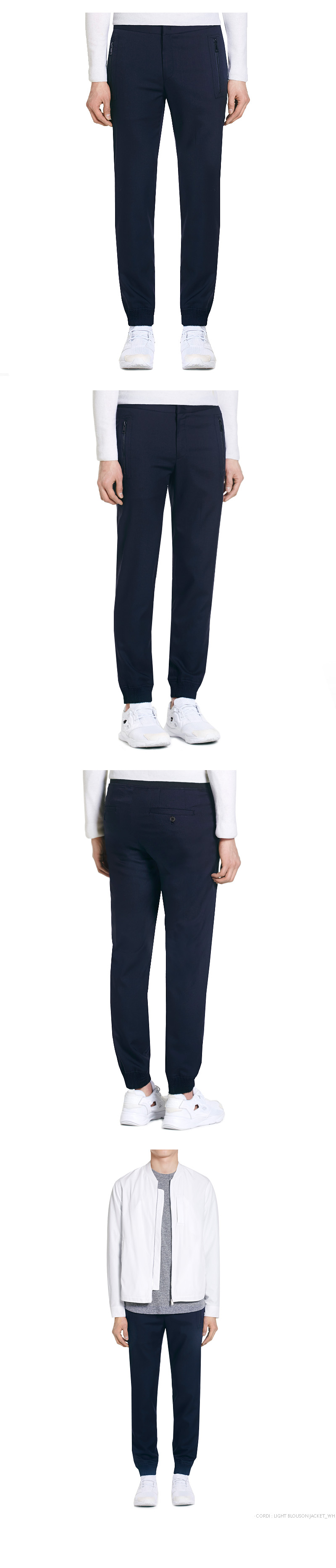 | - 슬림한 실루엣의 조거 팬츠 - 스판을 함유한 T/R원단 사용 - 지퍼 포켓 디테일 / YKK댕고 지퍼 사용 - 뒤 허리 벤딩(MADE IN JAPAN) 디테일 - 리얼 소뿔 버튼 사용 / 스티치, 바텍 보강공정 - 면사의 틀어짐을 방지하는 코아사 사용 - POLYESTER 64%, RAYON 33%, SPAN 3% | |