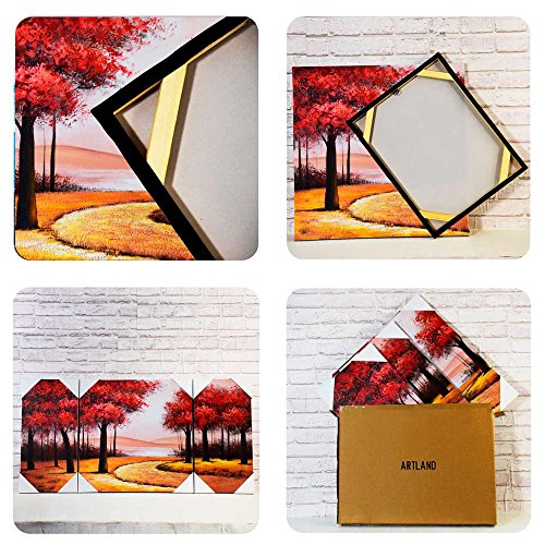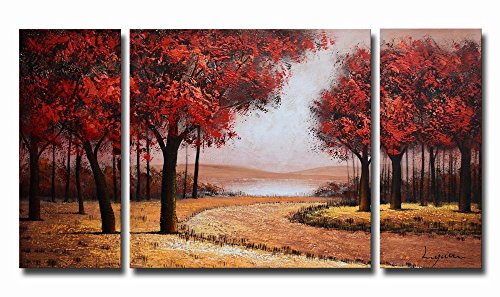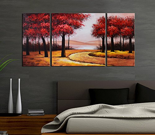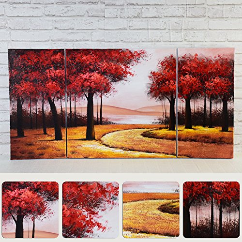 ARTLAND MODERN 100% HAND PAINTED LANDSCAPE OIL PAINTING ON CANVAS "RED TREE" 3-PIECE GALLERY-WRAPPED FRAMED WALL ART READY TO HANG FOR LIVING ROOM FOR WALL DECOR HOME DECORATION 24X48INCHES