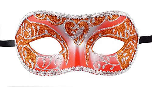 -. Brand : Bauer Pacific -. Color : Orange -. Department : womens -. EAN : 0768240379507 -. Feature : One Costume Eye Mask / Adult size (One Size fits most) / Measures 6"W x 3"H; Secures with two black ribbon ties on the back / Features a orange mask with silver-colored/orange glittering designs & an intricate lace trim / Perfect for making a statement at your next masquerade event! -. ProductGroup : Apparel -. ProductTypeName : ADULT_COSTUME -. Size : Adult Size -. Title : Carina Petite Glittered Eye Mask Costume Accessory - Orange -. UPC : 768240379507