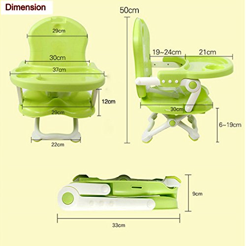 Baby Little Seat Specification: 3 Color Available: Blue, Green, Pink, great for baby girls and boys Material:Sturdy Hygienic PP Seat and Tray, durable Nylon straps Booster Seat Dimension: 14.5"L by 13.3"W by 19.6"H Folding Size:14.5"Lx13.3"Wx 4.3"H Tray wide:14.5"L x 8.2"W