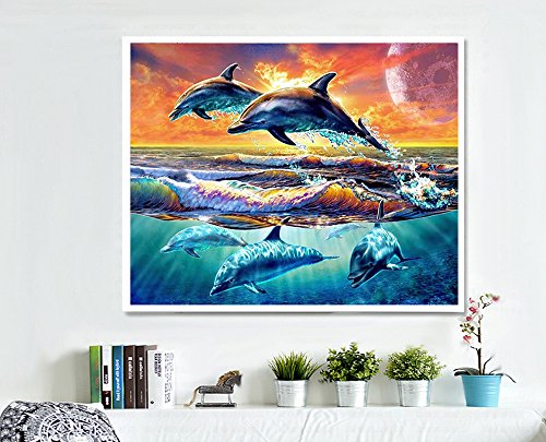 21secret 5D Diamond Diy Painting Full Round Drill Handmade Sea Sunset Playful Dolphins Cross Stitch Home Decor Embroidery Kit