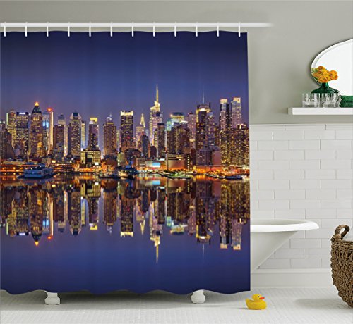 Landscape Shower Curtain by Ambesonne, Cityscape Scenery of New York City at Midnight Usa Ocean Reflection Coast Photo, Fabric Bathroom Decor Set with Hooks, 70 Inches, Multicolor