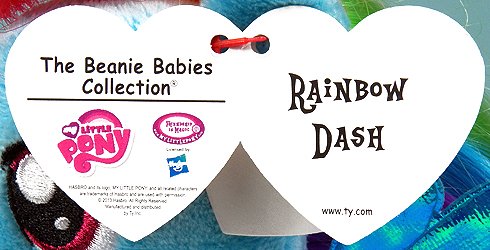 Studio : Ty Publisher : Ty Binding : Toy Product Description Rainbow Dash Rainbow Dash - My Little Pony - Ty Beanie Baby Ty family: Beanie Babies Style number: 41005 Variety: Animal: Pony Exclusive to: Special category: Licensed - Hasbro Birthday: none Introduction date: July 1, 2013 Off order: November 3, 2014 Height: 7.5 inches ST generation(s): 19 TT generation(s): 15 Theme: My Little Pony POEM None SWING TAG INSIDE Rainbow Dash - swing tag inside TUSH TAG FRONT Rainbow Dash - tush tag front ADDITIONAL INFORMATION Pinkie Pie, Rainbow Dash and Twilight Sparkle were the first three My Little Pony Beanie Babies Ty shipped to retailers in mid-August, 2013. (Left to right) Pinkie Pie, Rainbow Dash and Twilight Sparkle (Left to right) Pinkie Pie, Rainbow Dash and Twilight Sparkle Rainbow Dash - My Little Pony - Ty Beanie Babies 0