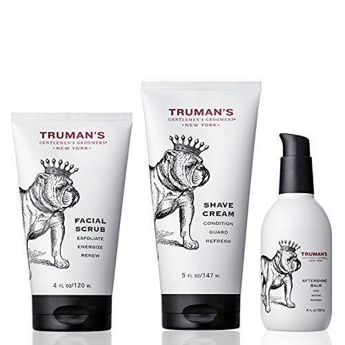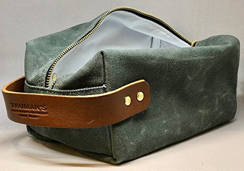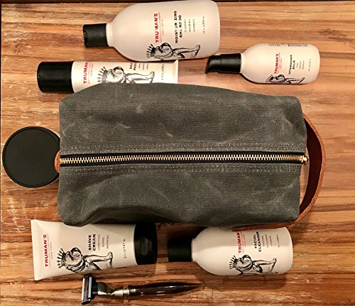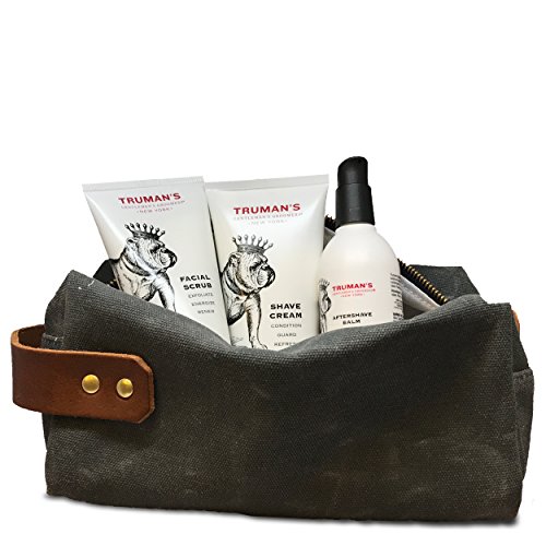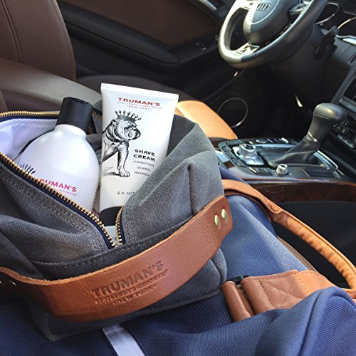 DOPP KIT - Take on the go, traveling abroad in style with a Truman's Dopp Kit. Shave regimen comes with Dobb Kit, Facial Scrub, Shave Cream and Aftershave Balm. Dopp kit made of canvas with a leather strap.